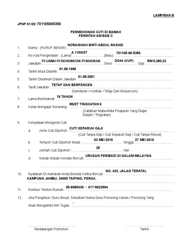 Cuti Tanpa Gaji Guru Sharahishe from lh6.googleusercontent.com Pada petang 12 ogos 2019, pegawai telah mengisi borang kebenaran keluar pejabat dalam waktu bekerja untuk urusan tersebut. Borang 3c borang permohonan cuti cuti tanpa gaji/cuti separuh gajucuti tanpa rekod di bawah perintah am bab c alamat pemohon: Borang permohonan tuntutan rawatan perubatan; Borang permohonan tuntutan rawatan perubatan dan pergigian; Borang cuti menjaga anak (cma) downloads. (perintah am bab c perkara 13 (a) (ii), (d)) Kesan ke atas perkhidmatan pegawai. Bagi maksud surat pekeliling perkhidmatan ini, senarai cuti bergaji penuh, cuti separuh gaji dan cuti tanpa gaji yang sedang berkuat kuasa bagi pegawai lantikan tetap adalah seperti di lampiran b.